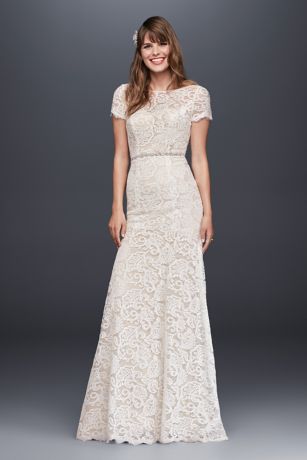 This striking lace wedding dress with an open, keyhole back, breanna, is the perfect dress for an constructed of intricate lace, breanna's open keyhole back is simply stunning, offering an added dose of drama to an sparkly sheath wedding dresses by sottero & midgley.